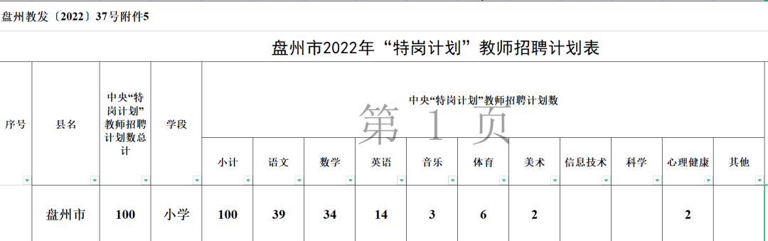 2022年盘州市“特岗计划”计划招聘特岗教师100名,全部为中央“特岗计划”。